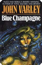 Megan was the first, and at that time the only one to use what was originally just a prototype, after she suffered brain and spinal injuries when she crashed into a tree while hang-gliding. She was a test case for the development of the device, and based on her usage it was improved multiple times. Megan had grown weary of making her videos, and of her managers, and all the hangers-on, but felt she had to continue. Otherwise she would not be able to afford the device that allows her to do them. A certain word is used to describe the type of videos she makes, or perhaps just the device one uses to watch them, a word which first encountered might give you the wrong idea. Megan is a Transer, and Anna-Louise calls her one of the Trans-sisters. Yes, Varley has many characters who have undergone sex changes, but here the word is more about the transmission of the signal. It would be even more correct to use Trancer, since the viewer enters the scenario in virtual reality. Megan and Cooper spend a lot of time together since he is a lifeguard in the Bubble's pool. They have a falling out, but I won't tell you why. She goes back to Earth, he stays on the Bubble for a while, but later goes to Luna where Anna-Louise has entered the police academy. "Blue Champagne" won the Locus Award for Best Novella, and was a Hugo finalist. Megan recurs in the next story, and Cooper is mentioned, but Anna-Louise is the main character.