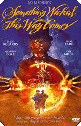 Now to the movie, which was originally supposed to be released by Paramount, but there might have been an executive regime change, or maybe squabbles over the script and budget. It ended up at Disney, in partnership with Bryna Productions. I like it, but as usual the book is much, much better, and I'm thinking it was the Disney connection that made it less scary than the story deserved. Bradbury wrote the screenplay, but there are still several changes, and it is shorter than it should have been, a little over ninety minutes subtracting the credits. The first noticeable change to the story and characters comes early. It is Jim that is a few minutes older than Will, so it should have been Will anxious to be older, the one more tempted by Mr. Dark and his carousel of time, but it is still Jim. After the first couple of minutes of exposition, spoken by narrator Arthur Hill rather than Bradbury, he does say something that confirms my opinion. It is more Charles Halloway's story than it is his son and best friend's. The age difference between father and son is still the same, even though Jason Robards was about ten years older than his character. Several times it is remarked upon that Will and Jim reflect the battle of good versus evil, Will being fair-haired, Jim dark. That is also reflected in Charles Halloway and his rival, Mr. Dark, a remarkable performance by Jonathan Pryce. I am pretty sure it was the first time I saw him, or at least took notice of him, since most of his prior work was in UK television, and the stage.